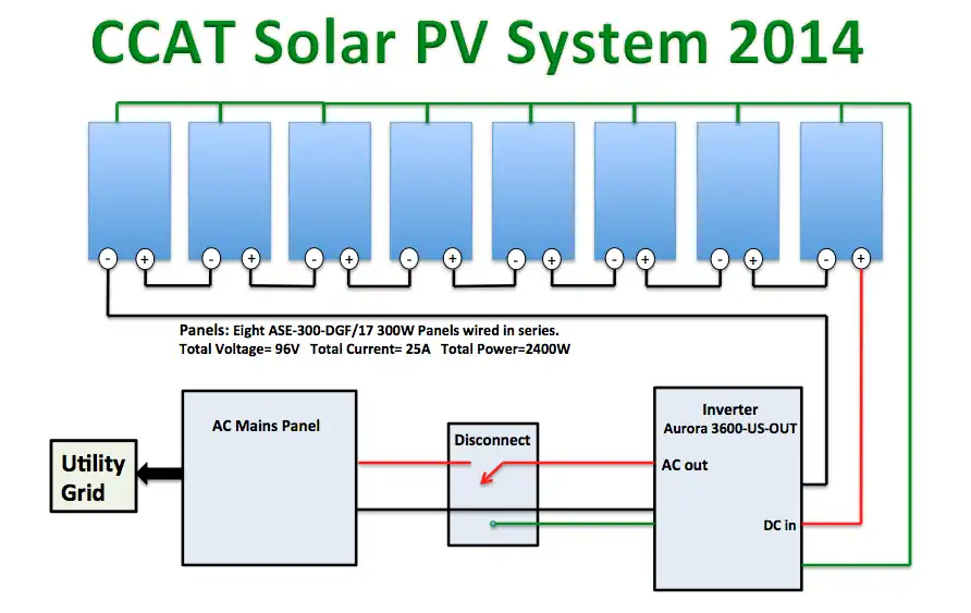 - During the process, they found out that the system configuration was not all 8 panels connected in a series as shown in CCAT PV 2014 but 2 series of 4 as shown in Figure 3 CCATs PV System Drawing below adapted from CCAT PV System Energy Analysis in 2015. They reconfigured it to 8 in series. Now the design is similar to the design shown in next section