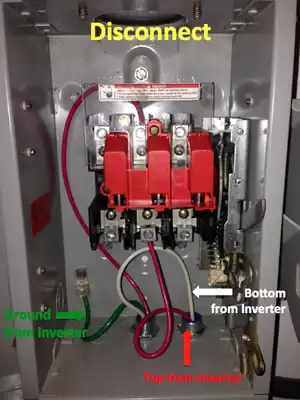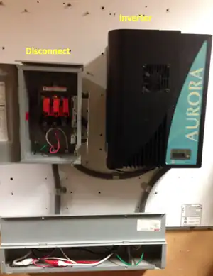 Each of the two inverters is independently connected to four PV modules wired in series. The inverters are factory-equipped with a 25 A breaker, a 30 A fuse and ground-fault protection on the DC input.They have a 15 A breaker, 15 A fuse, and surge arrestor on the AC output. The hot legs of the two inverter AC outputs are switched using a PG&E approved, 30 A, double pole disconnect switch. This is a lockable, visible disconnect switch, mounted alongside the main service panel next to PG&E's meter, and meets PG&E's interconnection requirements.