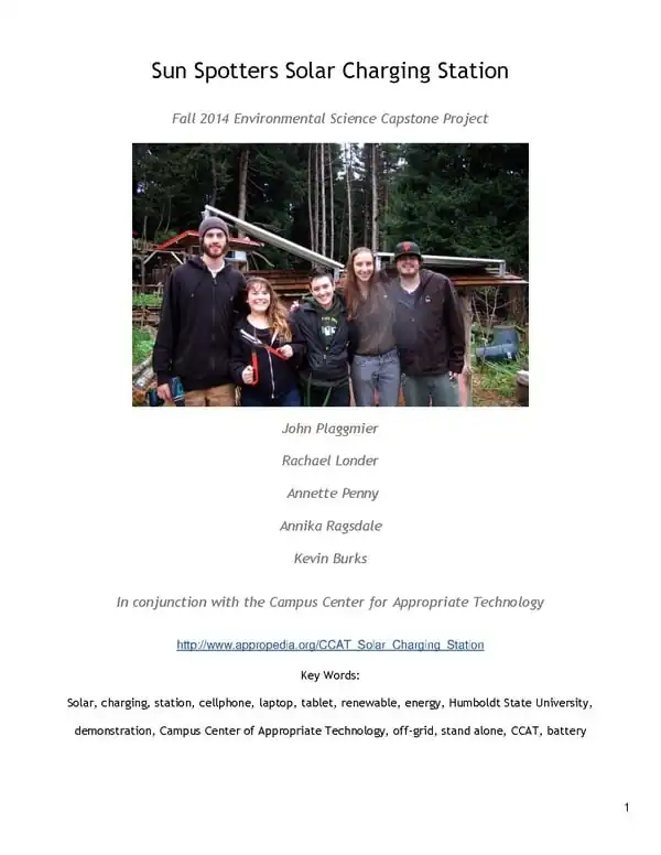 The Campus Center of Appropriate Technology is a demonstration house located on the Cal Poly Humboldt campus, Arcata, California that is a resource for students and faculty. CCAT has many different technologies on display such as: solar panels, rainwater catchment, organic gardens, a greywater marsh, and an experimental composting toilet, among other things. These projects are on display as educational tools to the community and information is provided through CCAT/Appropedia on how to recreate these technologies on your own. The Solar Charging Station at CCAT will align with the mission of CCAT to provide education and resources to the community, by clearly expressing how off-grid solar works, while being functional for cell phone/laptop charging.
