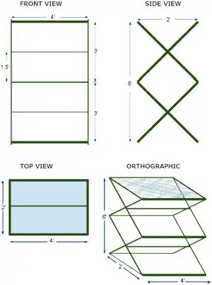 The general design is 2 main rectangles 3.6'x 4' divided into two squares by a horizontal piece. Each rectangle is then joined by a diagonal piece on ether side. Each bottom pole is tied to the leg of it's opossing side peice to prevent over expanding.