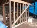 So far we are thinking light straw clay or woodchip-clay with a lime plaster would be a good application, since there is an overhanging roof, a raised foundation, and the ability to have lime plaster as well as borax added to the clay slip to prevent mold growth. There is already a test wall of straw clay with a lime plaster that we will use as a resource for seeing what works best in our environment here.