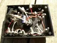 Motive Engineering allowed us to use their wire feed mig welder earlier in the project. They wanted to help by donating some of the materials that they had a lot of. A black plastic wiring box that they use in their solar powered wheel line kits and 20 feet of 10 gauge wire given to us free of charge. The plastic wiring box serves the purpose of containing the Volt Meter and LED's while protecting the wiring connections from the elements. We knew from our previous testing that we wanted to install ten LED's in parallel. We marked the black plastic box at the locations that we wanted to put LED's. We then drilled two holes for each positive and negative side of each LED. Using the ten gauge wire and wire nuts we connected the appropriate positive longer wire of each LED to the positive of the next and the same for the negative ends of the ten LED's to make them in parallel. The Volt Meter was also wired in parallel so that it would measure the voltage across the whole circuit. The Capacitor was also wired in parallel so as to store excess voltage in the way we wanted. The volt meter also had a 15K ohm resistor in series with it in order to obtain accurate voltage readings. A 20 Ohm resistor was also added in series with the bank of LED's to prevent them from getting to much current and burning out. Sizing of this resistor was determined by placing this resistor in series with three AA batteries in series. One LED was also placed in parallel. Three AA batteries in series would be enough to burn out the single LED without a resistor, but with the 20 ohm resistor in series, the LED did not burn out, but still lit up, proving to be sufficient for the job. A much larger hole was made with a hacksaw blade and box cutter so that the meter could also be mounted in the box.