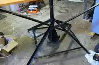 The frame was built out of two reclaimed bed frames that we found stashed in the back yard. We designed a four sided pyramid shape frame that would offer wide support in all directions. We first clamped the four legs in place on the tower while it sat on level ground and then proceeded to try to tack them in place to get a better visual. Every thing was how we liked it so we removed the clamps and two of the four legs fell to the ground. The tower was galvanized and was not getting any penetration on the welds. Using a disk grinder and ventilator we were able to remove the outer galvanized coating and weld successfully. The four legs by themselves did not offer much support. Using the smaller bed frame as cross bracing, the frame became a lot more ridged. The frame also needed to be mobile, so we designed a dolly like mount using training wheels. This would allow the turbine to be easily moved from place to place by one person.