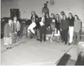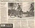 In 1993 Bart Orlando began his volunteer efforts at CCAT by receiving permission to pedal power the PA system used at a speech given by David Brower at HSU. A crowd of over 400 people attended the event. The bike with the ape-hanger handle bars is Bart's Bike back when it was still a 15 speed. A friction wheel rolling along the rear tire spins when the bike was pedaled in place, like an exercise bike. The friction wheel was a 2" diameter skate board wheel, adapted to attach to the 5/8" drive shaft of the 1/4hp, 24v, 1800rpm permanent magnet DC motor/generator. Because of the relative size of the skateboard wheel and 27" rear bike tire, the rpm of the generator was approximately 900 rpm. Its output voltage, (which is proportional to the speed at which the generator is spun), was approximately 18v. That voltage was suitable for charging the 12v battery which powered a 200 audio watt Alpine car stereo amplifier and 200 audio watt JBL speakers.