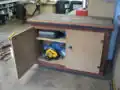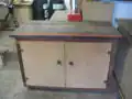 The CCAT pedal power lab was located in the basement workshop of the CCAT house. Bart Orlando began building pedal powered devices there with the assistance of HSU students in the mid - 1990s. Students who worked on pedal powered projects with Bart received class credit in the engineering courses. In 1998 Steve Sakala, Daniel Poten and Bart Orlando co-authored a grant proposal to the Society for Sustainability and Innovation. The grant requested $10,000 for a variety of pedal power projects including the conversion of the basement workshop into the pedal power lab. (Instead of granting the full sum requested, $5,000 was given to CCAT with which to complete all the projects in the grant proposal. Other grant projects included the pedal powered concert generator and the pedal powered tv/vcr.) Grant funds were used to purchase salvaged old growth dug fir beams which were milled with the assistance of Blue Ox Mill Works in Eureka, CA. This wood was used to frame the cabinets shown above. The doors and side walls of the cabinets were made from sheets of compressed wheat straw, an alternative to using particle board. Particle board contains carcinogenic formaldehyde and should not be burned in a woodstove or fireplace because of the poison smoke given off. However, the left over scrap bits from this cabinet project could be burned for heat in a wood stove of fireplace because wheat straw board contains nothing but wheat straw - compressed under super high pressure. Particle board also off gases poisonous vapors at room temperature whereas wheat straw board does not. Travis Boland, Peter Williams, Johnny Gary, Matt Rhodes and Bart Orlando each worked on the construction of the cabinets. The CCAT pedal powered workshop has been dismantled to make way for the new Behavioral and Social Science Building. Donations towards future CCAT pedal power projects would be greatly appreciated.