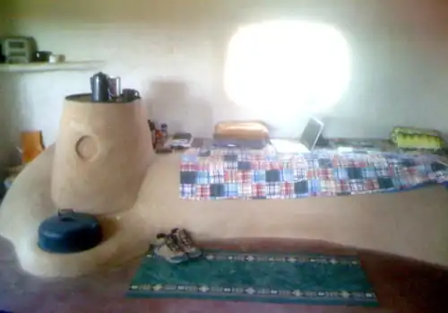 A rocket mass heater, or rocket stove, consists of a right angle 'J' shaped combustion chamber inside of an insulated container. This insulation container creates a draft in which the heat gasses are drafted and then pushed through piping into the mass. This concept can be applied to heat earthen built furniture in homes that contain high thermal mass.[1]