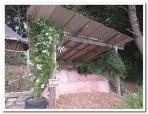 The roof covering the cob bench is nearly trapezoidal. With some measurements, it looks a bit like this:
