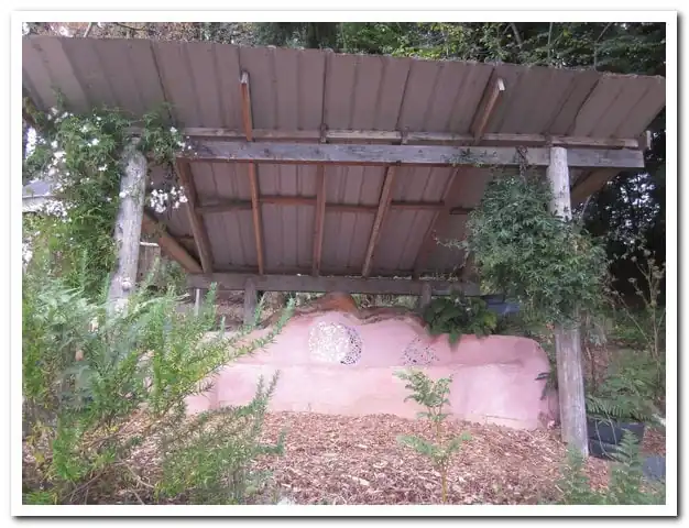 - To keep the heavy rain overflow from damaging the cob bench, several ferns were strategically planted to shield the bench.