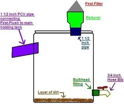 When it starts to rain, the first flow of water off of your collection surface may be contaminated by dust, pollen, bird plop, or leaves.<ref>ibid.<ref>A simple first flush system will allow these contaminants in the initial rainfall to settle out in a bucket separate from the main storage tank. When it starts to rain, the water that first flows down the roof washes off the dirt and grime and sends it into your first flush bucket. The first flow of "dirty" water will settle out in the bucket. As rain continues to fall, the water flowing into the system is progressively less dirty, and the bucket fills up. This "cleaner" water enters the now full bucket, which overflows into the main storage tank. This maintains a cleaner environment inside the main storage tank, and makes cleaning the system quite a bit easier.