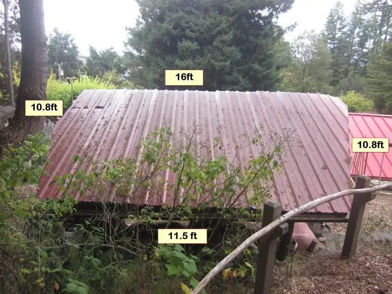 - During heavy downpours, some of the flow off of the roof overshoots the gutter and lands on the ground. This is in part due to the slightly varying lengths of the corrugated metal used as the main roofing material, as well as higher velocity due to an increased flow of water.