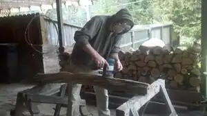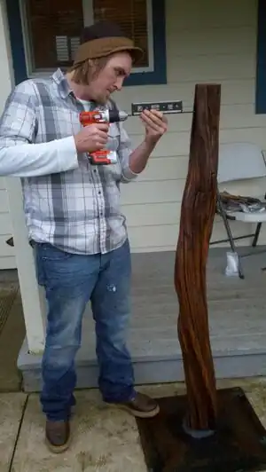 Using an electric drill with a 1/2 inch drill bit, drill a hole in the bottom of the driftwood to mount the support post to the base. Using a level, drill another hole at the top to mount the wheel.