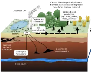 Carbon sequestration means removing carbon (as carbon dioxide) from the atmosphere and locking it up in a form where it will not enter the atmosphere for many years.