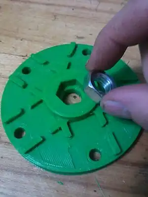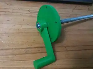 Screw another nut onto the rod. Press the final nut into the handle and screw it onto the threaded rod (crank handle up) until it makes contact with the free nut. Using your fingers, tighten the crank handle while loosening the free nut until the two are firmly fit together.