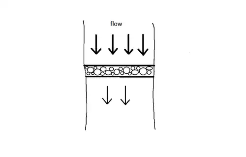 In order to determine Qout, the amount of cross-sectional area reduced by the check dam must first be determined. This value can be estimated by determining the porosity of the check dam. Porosity (n), is defined as the volume of air space (voids) in proportion to the total volume in a sample of soil of aggregate,[5] and since the ratio of volumes in a given sample is equal to the ratio of areas, porosity can be written as