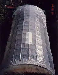 The greenhouse design was similar to inexpensive "tube" greenhouses. Outer dimensions were 16x30 feet. The foundation walls consisted of 3 courses of rye grass straw bales pinned together with 1/2 inch steel rebar. Bale size was 2 feet x 2 feet x 4 feet, giving two-foot thick walls along the base. Therefore inner dimensions were 12 feet wide by 26 feet long. Bales were stacked like bricks, as is typical of straw bale construction. A layer of 3 mil plastic film surrounded the bottom bales, separating the straw from a layer of wood chips on which the bales rested and the compost which filled the greenhouse about three feet deep inside (except for a 5 feet by 12 feet entry at one end). The roof consisted of 6 mil ultraviolet resistant plastic film supported on 20 foot arches of rebar spaced every 2 feet along the length of the structure. These arches were held rigidly into a 2 feet x 2 feet matrix with horizontal rebar spaced every 2 feet running the length of the structure. The straw bales on the sides and end walls were also covered with the same plastic film as the roof with a door framed out of lumber at one end. A single sheet of 32 feet wide by 32 feet long plastic covered the roof.