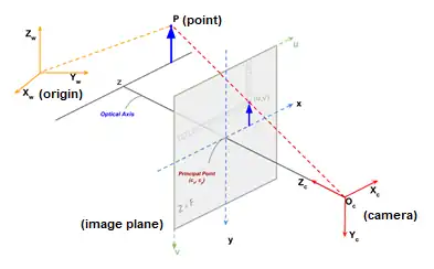It is necessary to establish a relationship between the coordinates of the 3D camera and the coordinates of the 3D room. The camera is located in a random part of the room. The camera coordinate is translated relative to the world coordinate. It is also possible for the camera to look in an arbitrary direction. In terms of world coordinates, the camera is rotated. The image plane is placed at a distance f (focal length) from the optical center. The project image (x,y) of the 3D point (Xc, Yc, Zc) is given by: