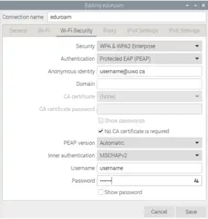 When implementing devices like Raspberry Pi, Arduino, ESP32, etc. into Internet of Things (IoT) projects, most tutorials rely on having a WPA2-Personal WiFi connection which only requires a password. However, more secure networks, like WPA2-Enterprise found at many university campuses and schools, requires a username and passwork among others. This page provides a step-by-step guide on how to connect your WiFi enabled devices to a WPA2-Enterprise network like eduroam or uwosecure-v2.