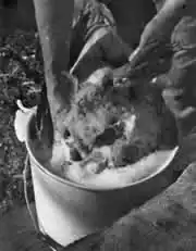 Since the feathers on a goose are very thick and full of oil that makes them cling together, it is helpful to soak the bird in cold water before scalding. Soaking helps saturate the feathers. In more recent times some people soak the goose in water sudsy with detergent. The modern detergent cuts the oil better and allows the water to penetrate to the skin. (see photo #3.)