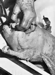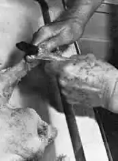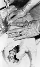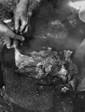 Wash the skin thoroughly with clean cold water to remove any feathers, soot from singeing and other dirt. The skin should be soft and oily and a slightly yellowish white.