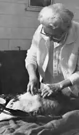As you work with the goose meat you will notice how much fat there is in it before cooking. For that reason it is helpful to place the bird on a rack in the roasting pan so that as it bakes and the fat cooks out, you can dip it out. Because the meat is so moist there is no need to baste. Bake in a covered pan at 375°F until tender. Ella covers hers with aluminum foil today. Goose takes longer to bake than turkey. A ten pound young goose might take about three hours. The cooking time depends on the size and age of the bird. When tender remove the cover, turn the heat up to 400° and brown. The main difference in baking goose and other fowl is the excessive amount of fat which should be dipped out as it accumulates.