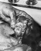 From here on the goose is prepared as any other fowl. To cut off the feet, bend them down and with a sharp knife cut through the skin and membranes at the joints. Discard the feet. (see photo #8. )