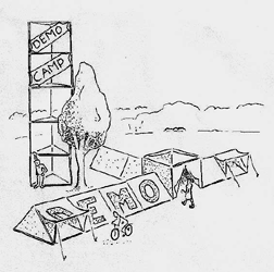 Due to its light weight, bamboo is an ideal material for Democamp construction. Put together bamboo rods that are 2.1 meters long with diagonal wire connections. The bamboo rods are easy to transport and can be put together in minutes at the edge of a demonstration. The single units need to be constructed ahead of time out of wire and bamboo. The basic structure always remains the same, but it can be transformed easily into many different forms. Four people can sleep in each unit and it is high enough that a person can stand up inside of it. If you prefer to build the unit as a square rather than a triangle, it can be used as an improvisational office or room. If the unit is covered with heat-blocking foil, it can be used as a place to recover from sunstroke. Three people can easily assemble a unit, one standing on each corner. In addition, if the unit were to unexpectedly fall on a crowd, injuries would be minimal due to the lightness of construction.