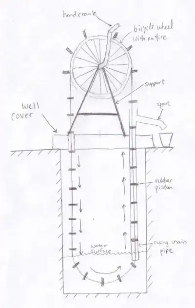 As the bicycle wheel is turned, the rope and pistons move freely downward, before dipping just under the water surface. The pistons then get pulled into the PVC pipe, and create a suction with the surrounding walls. Upon immediate entrance of the pipe, any water above the piston will begin to be pulled upward. Finally, a spill pipe above the well surface allows water being pulled up to be collected for use. The cycle then repeats itself, as each piston travels along the bicycle wheel, and down into the well once again.[2][3]