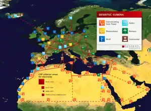 DESERTEC is a concept proposed by the DESERTEC Foundation for making use of solar energy and wind energy. This concept will be implemented in North Africa and the Middle East by the consortium Dii GmbH, formed by a group of European companies and the DESERTEC Foundation. The DESERTEC concept was initiated under the auspices of the Club of Rome and the German Trans-Mediterranean Renewable Energy Cooperation (TREC).
