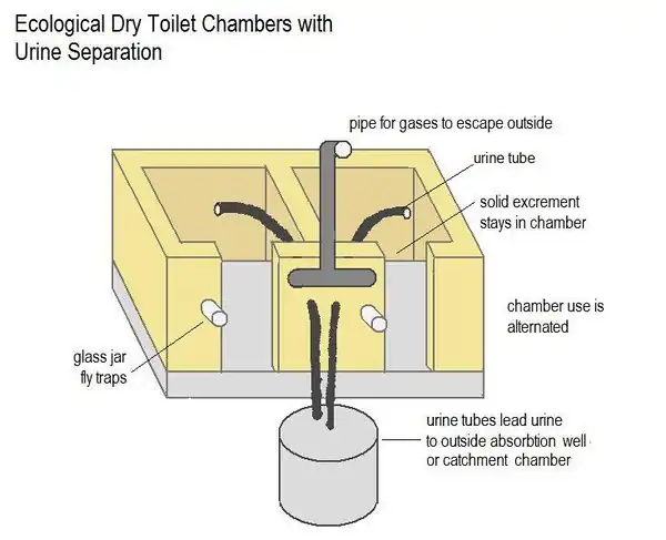 - Whether just the bare hole is used, or a toilet seat is included over the hole, the urine must be separated using a small triangle-shaped cup (or funnel) that has been attached to the underside of the slab, at the front of the hole, and that protrudes out into the hole far enough to capture excreted urine product. This triangular cup (or funnel) should have a small hole set in its bottom for the attachment of a tube via a hose clamp (worm drive screw tightened band clamp) that leads out to an underground external absorption chamber or other separate collection chamber, where it can be collected for use.[2]