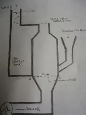 The design of the stove can be seen from the diagram. Air is blown in from the bottom of the chamber, which moves up as it is pre-heated. A funnel on the right side inserts powdered cow dung in to the chambers. A small chimney on the right side, above the ash storage tank, is used for the gases to escape from.