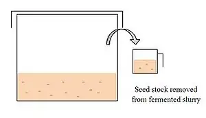 Remove a portion of the fermented slurry (potatoes and yeast) from the fermentation container to seed the next batch for fermentation. This 'seed' batch will contain some of the potato mixture and some of the yeast, which will allow the yeast to then be stored for several days. The semi-active yeast will consume the starchy mix, replicating by budding and replenishing the yeast source in preparation for the next fermentation batch. Add the fresh (unfermented) potato slurry removed in the previous step to the seed stock so that the yeast has some fresh glucose on which to feed and replenish itself.