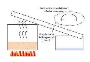 Once fermentation is complete and a seed batch has been removed, it is time to extract the ethanol from the fermented mixture. Since ethanol evaporates at approximately 78 degrees C[7] and water boils at 100 degrees C, this can be accomplished by heating the mixture to some temperature in the range 78-100 degrees C (i.e. 80, or 82 degrees C) where the ethanol will evaporate and can be collected by a condenser but the water will remain in solution. The condensate can then be re-distiled as necessary to achieve sufficiently high alcohol concentration to produce an effective hand sanitizer.