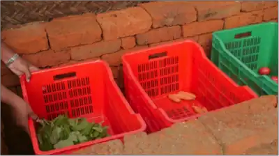 Evaporative cooling chambers (ECCs) can be made from locally available materials including bricks, sand, wood, dry grass, gunny/burlap sack, and twine. The space in between the two brick walls is filled with sand, which retains the water that is added. If the evaporative cooling chamber is not build in an area that is well shaded, a shed must be constructed to provide shade. Inside the ECC, food is placed in unsealed plastic containers, which keep the vegetables off the ECC's floor and allows them to breathe and be exposed to the cool, humid air inside the device.