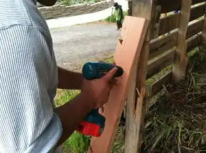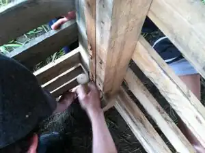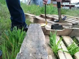 Take any extra pallets you may have and remove the planks of wood. This wood is perfect for doors and will save money since pallets are free.