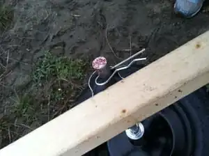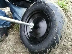 Two wheelbarrow wheels are attached to a metal axle to be added to the stretcher for use as a wheelbarrow. The wheels are six inches apart to spread out the load of the weight so that it will be easier to use on sand.