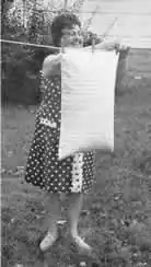Now remove the bastings from the sack, and sew up the opening in the pillow tick. The final step is airing. Pin the finished pillow on the line. Airing blows the down off the outside and makes the pillow fluffier. For best results select a cloudy day with a good breeze.