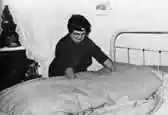 Making up the feather bed is another trick, because it is so soft every imprint shows up easily. When you get up in the morning, it is all crumpled down. First you shake all the feathers to one side, then turn the tick over. Push and smooth the feathers with your hand so it will be smooth. Also another way of making it look nice and smooth is to take a broomstick handle and run it across the tick. People were not allowed to sit on the feather bed during the day, nor could children play on it or they would spoil the smooth finished appearance.