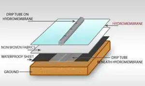 In order from the ground up, there is the waterproof sheet, a drip tube beneath the hydromembrane, next layer the non-woven fabrics, on top of which comes the hydromembrane itself, with a drip tube on top of the membrane.