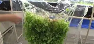 The hydromembrane film absorbs the nutrients released from the lower drip tube, where it is held by the film. It does not penetrate the through to the plant side, until the plant's extremely thin yet very dense roots induce osmotic shift which allows the absorption of nutrients and water. This creates high nutrient produce using minimal water and space.
