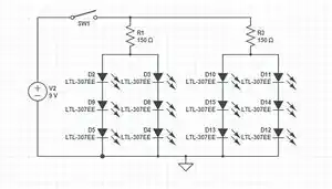 The forward voltages of the LEDs add together when they are connected in series. This is important, because the configuration will determine what resistor or resistors to use to limit the current for the circuit. The example circuit has 3 LEDs in series, with an identical branch in parallel this does not matter for this part. Each LED has a forward voltage of 2 volts, so 6 volts will be dissipated across the LEDs, since they are in series. Using Kirchhoff's Voltage Law and algebra, the volt is solved by finding the remaining voltage drop after the LEDs. This is found from taking the 9 voltage source and subtracting the voltage drop across the LEDs, which yields a value of 3 volts that will be the potential (voltage) across the resistor. Using Ohms law, which is voltage equals current multiplied by resistance, this gives a value of 150 ohms for the example.