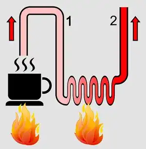Principle of superheated steam: Water is heated in a boiler, generating saturated steam (1). It is then heated further in a"superheater" and is then (2) able to absorb additional moisture.