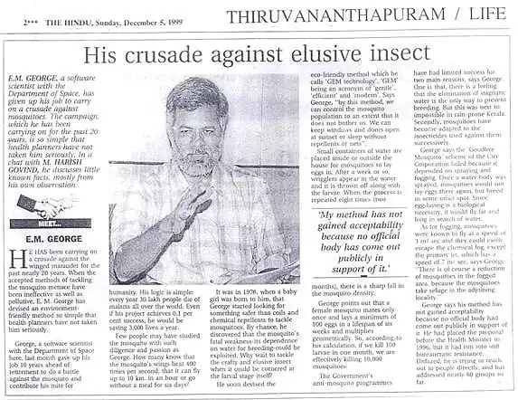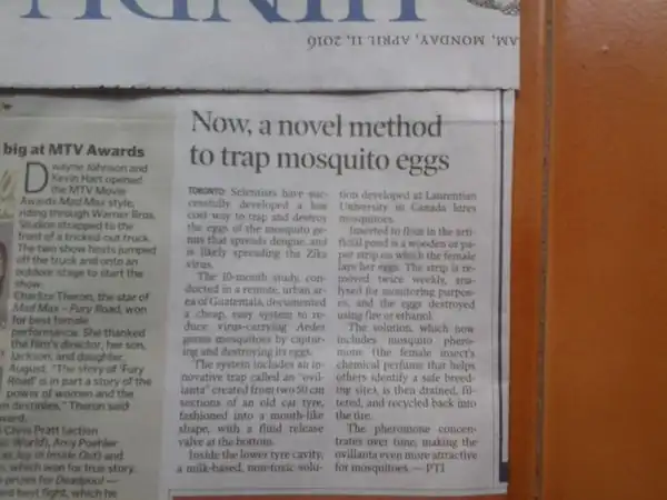 The Hindu Thiruvananthapuram (page 20, 4 Apr 2016) reported: "Now, a novel method to trap mosquito eggs"