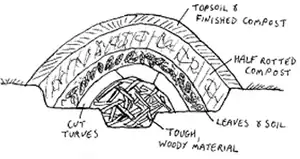 In summary, the technique involves digging a circular trench about 1' deep and 5' wide, in the centre of which is dug another 1' deep hole into which the rough material is piled. Turves are then stacked face down onto this pile, then layers of compost, well rotted leaves, manure, etc. are added. The layers gradually break down slowly releasing nutrients and creating rich humus over four or five years; this is ideal for growing hungry crops such as courgettes or strawberries.