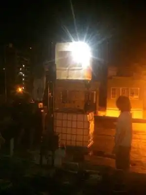 | Liquid Shipping Container | Roughly a cubic meter | Solar array is mounted to the top and the cube is used to house batteries, invertor, as well as the charge controller. | ![]() |
