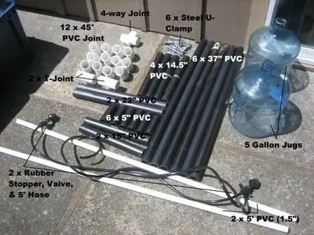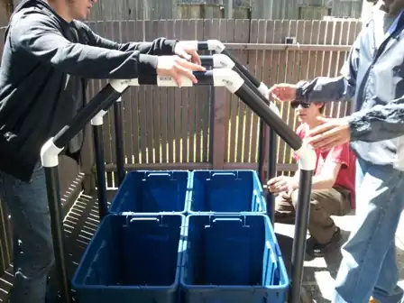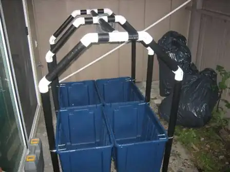 Each storage container used by the GGC is 18" wide and 16.5" tall. Listed are the dimensions for each PVC section cut that are measured to work with the stated container size. A local Ace Hardware is able to cut each piece to the specified dimension for no charge. A PVC pipe cutting tool was used by the GCC. All black piping pictured with corresponding joints is 1.5" wide. (Disregard white PVC pipe and water catchment) | |