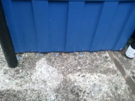 The PVC frame is measured so that all three legs fit snugly around the container base. The legs need to be secured to the base at the ends and center using metal U-hinges. Drill holes two inches apart on each side of all 6 legs surrounding the container base. Drill these holes near the top of the containers as shown. |