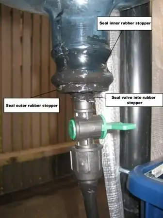 In order to create a water tight seal silicone is used around all connection for the water catchment system. A rubber (cork-like) stopper must first be drilled and bored out to allow space for one half of the valve to fit into as pictured. Before inserting the valve silicone liberally around the rubber stopper and insert it tightly into the head of the water jug. Invert the water jug and apply silicone to fill the gap around the inside of the rubber stopper (do not plug the drilled hole with silicone, water must flow through this) Next apply silicone liberally around the valve head and insert the valve tightly into the hole in the rubber stopper. Seal around every seam to ensure no leaks. Apply silicone around the ½" rubber hose and insert into the bottom end of the valve as shown. Seal seams with extra silicone. Allow silicone to dry for 24 hours. | |