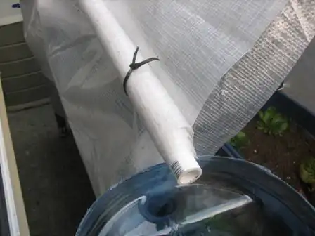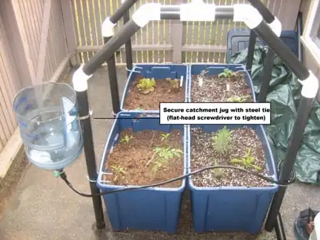 Cut a 5' by 5' square of greenhouse sheeting. With two 5" ¾" PVC pipes tightly roll the sheeting around each PVC pipe. Each pipe should be initially rolled at a small angle facing in opposite directions. This step can be completed one side at a time. Simply roll the sheeting around the pipe until it sits halfway on the arched PVC roof area shown. Attach the gutter with zip ties by cutting small holes through both layers of material shown above. Test the gutter with water to ensure a proper gutter angle and good drainage into the storage jugs. The zip tie closest to the water jug should not be too tight as to restrict water flow. | |