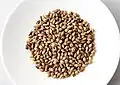 The seeds (seed-fruits or achenes) of buckwheat are of a pyramid shape and are the size of peppercorns.