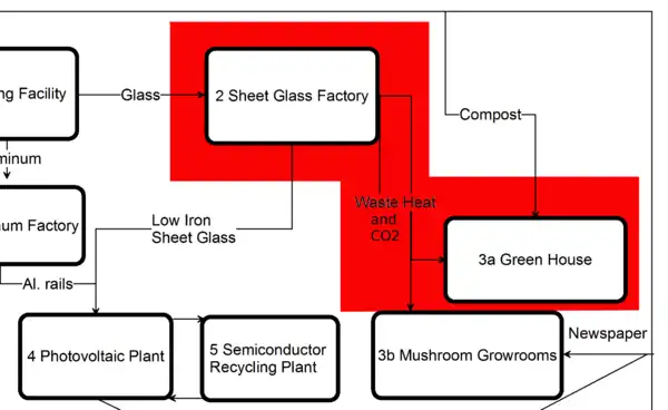 It should be noted that the choice of these two industrial segments is meant to represent the possible symbiosis between an industry utilizing a large natural gas furnace (such as iron smelting, power generation, or cement kilns) and a greenhouse requiring large volumes of low temperature thermal energy, which could also include other vegetable or floricultural crops. The choice of these two industries in particular was to support previous research into the Industrial symbiosis in photovoltaic manufacturing as seen in the figure below.[1]